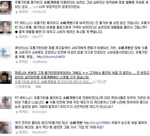 한 네티즌은 트위터를 통해 “유통기한 대신 소비기한을 표기하겠다는 것은 물가와 상관없이 기업들 배만 더 채우고 소비자 권리를 축소할 것이라는 뜻”이라고 지적했고, 또 다른 네티즌은 “부패가 눈에 보이기 직전까지 판매하란 얘기냐”며 부정적인 반응을 보이기도 했다.