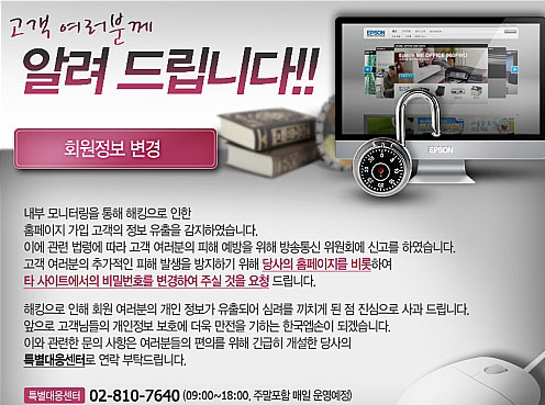 한국엡손은 지난 13일 내부 모니터링 후 홈페이지에 가입고객 35만명(모든 고객 추정)의 고객정보가 해킹된 것을 확인했다고 20일 밝혔다. 유출된 개인정보는 아이디(ID)와 비밀번호, 이름, 주민등록번호 등이다.