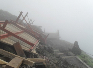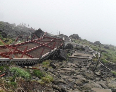 이달 초 태풍 '무이파(MUIFA)'가 제주도를 강타하면서 한라산 정상 부근의 등산로가 일부 파손된 상태로 방치돼 있다. 한라산국립공원 관리사무소 측이 부분적으로 시설보수에 나서고 있으나 태풍이 휩쓸고 지나간지 2주일이 지나도록 정상부근의 통행이 위험천만한 상황이다.