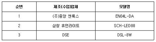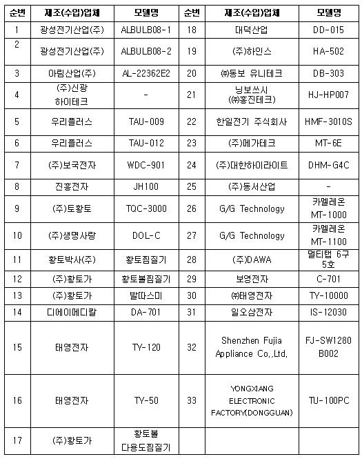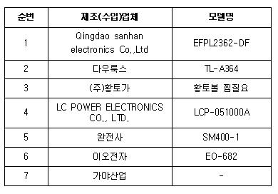 이번에 조치된 제품은 광성전기산업, 아림산업, 신광하이테크 등 모두 중소제조업체 것으로 조명기기 7개, 온열기기 13개, 마사지기 등 생활용품 3개, 주방용품 2개, 직류전원장치 5개, 멀티콘센트 6개이다.