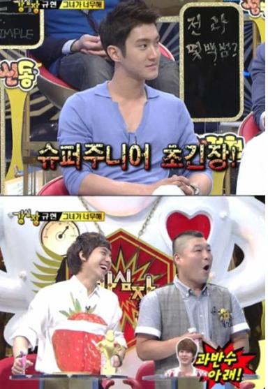 이에 강호동은 김희철에게 "슈퍼주니어 10명의 멤버중에 몇 명이 교제중이냐?"라며 질문했고, 규현은 "확실한 것은 과반수 아래다!!"라고 말해 팬들의 궁금증을 자아냈다.