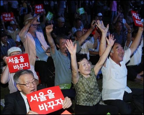 | <무상급식 투표율 미달로 개표가 무산되자 서울광장에 모여 무상급식 투표를 반대했던 시민들이 환호하고 있다.> |