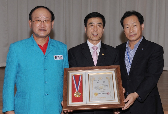 ▲ 김충석 여수시장은 ‘자랑스런 글로벌 리더’로 선정, 25일 오후2시 글로벌교육연합회로부터 증서와 상패를 전달받았다. 좌로부터 김진익 한국글로벌문화개발원장, 김충석 여수시장.