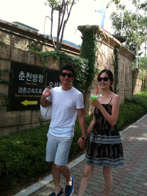 선글라스를 낀 아내와 한껏 다정하게 손을 잡고 있다.