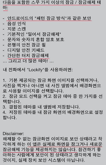 기자가 제품 설명을 확인해본 결과, ‘안드로이드의 패턴 잠금 방식과 같은 보안’, ‘간단한 터치 잠금 해제’ 등 오해의 소지가 있는 문구를 여러 차례 기재하고 있었다. 또한 '실제 보안 시스템이 아니라'는 문구는 화면의 맨 하단에 위치하고 있어 쉽게 눈에 띄지 않았다.