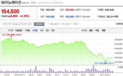 SK이노베이션은 1년 전 12만500원(2010년8월26일 종가)에서 이달 초 22만3천원까지가 주가가 올랐다. 그러나 미국발 증시불안으로 인해 주가가 40.8%나 폭락해 한때 13만2천원까지 내려앉았다.