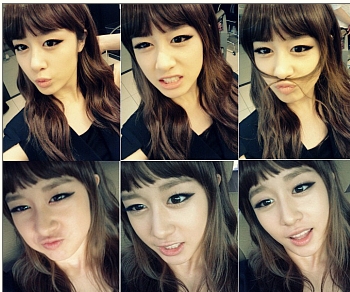 사진 속 지연은 스모키 화장을 하고 짧게 자른 앞머리로 이마를 가린 채 깜찍한 표정을 짓고 있다.