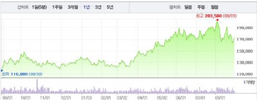 지난 3일에는 20만3천500원 기록하며 최근 1년 사이 최고치를 기록했다.
