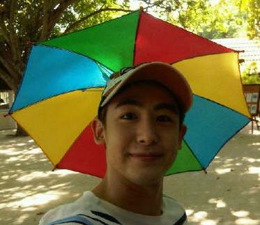 이는 팝가수 리한나의 히트곡 'Umbrella'의 가사 중 일부분이다. 사진 속 닉쿤은 알록달록한 무지개 색상인 우산모자를 쓴 채, 햇볓을 차단하며 귀여운 미소를 짓고 있다.