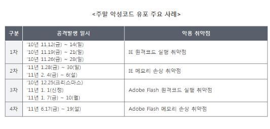 따라서 중국 해커가 게임아이템 등 탈취목적을 가지고 악성코드 배포행위를 한 것으로 추정된다. 지난해 11월부터 현재까지 총 4차례에 걸쳐 주말을 이용한 악성코드 유포사례가 확인됏다.