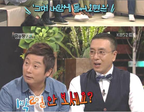 그러자 이수근은 방청객에게 "1박2일 안보세요?"라며 정색해 웃음을 줬다. 이는 조관우가 출연중인 '나가수'가 이수근이 출연하는 '1박2일'과 같은 시간에 볼 수 있는 방송이기 때문에 장난으로 발끈하는 모습을 보인 것이다. (사진=KBS 방송 캡처)