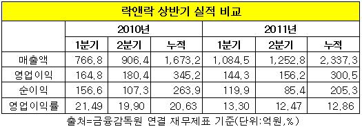 1일 금융감독원에 따르면 연결 재무제표 기준으로 락앤락의 올 상반기 매출액은 2천337억3천만원, 영업이익 300억5천만원, 순이익 205억3천만원을 기록했다. 지난해 같은 기간 동안 매출액과 영업이익 순이익이 각각 1천673억2천만원, 345억2천만원, 263억9천만원이었던 것을 감안할 때 올해 실적은 어닝쇼크 수준이다.