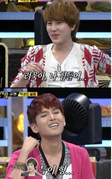 이에 멤버 려욱이 “어느 날 규현이 소주를 마시고 들어와‘힘들다’며 눈물을 보였다”고 전하며 "누구 때문이냐고 물었더니 "특이 형.."이라고 말한 후 잠들었다"고 전해 웃음을 줬다. (사진-SBS 강심장 캡처)