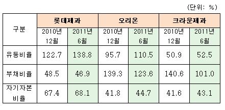 특히 롯데제과는 단기채무 지급 능력을 나타내는 유동비율이 작년 12월 122.7%에서 올해 6월 138.8%로 16.1%의 가장 큰 폭의 상승률을 보였다. 부채비율도 가장 낮은 46.9%를 기록했다.