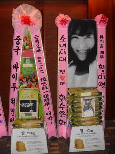 소녀시대 팬카페 ‘화수은화’는 지난달 30일 서울 롯데호텔에서 진행된 뮤지컬 ‘페임’ 제작발표회에 100kg짜리 쌀화환을 보냈다.