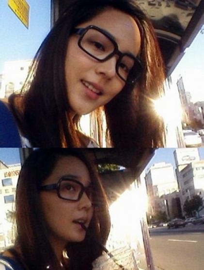 가수 유진이 뿔테 안경 셀카를 공개했다.