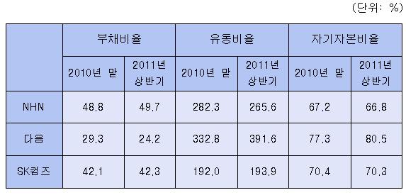 NHN, 다음커뮤니케이션(이하 다음), SK커뮤니케이션즈(이하 SK컴즈) 등 포털3사는 부채비율, 유동비율, 자기자본 비율 등 대표적인 재무건전성 지표에서 모두 합격점을 받았다.