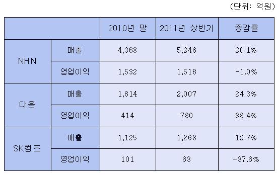 재무건전성에서 대체로 좋은 점수를 받았지만 상반기 실적에서는 다음-NHN-SK컴즈 순으로 희비가 갈렸다.