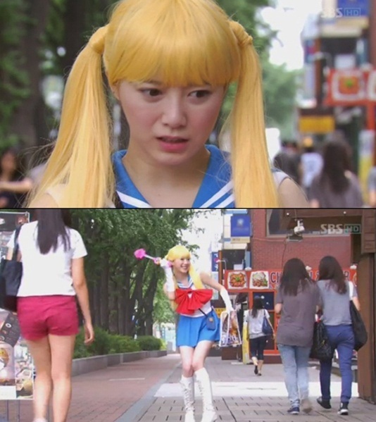 극 중 뮤지컬 배우로 거듭나기 위해 고군분투하는 고은비(구혜선 분)는 코러스 배우 사복자(박경림 분)에게 속아 세일러문으로 변신해 카페 홍보하러 다녔다.