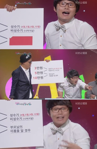 그는 이어 “근데 부모님이 내 이름을 아는지 모르는지 헷갈릴 경우가 있다. 일단 5만원을 봉투에 넣고 결혼식에 간 뒤 인사할 때 나를 아시면 5만원을 더 넣는다”고 덧붙여 폭소를 자아냈다.(사진=KBS 화면캡처)