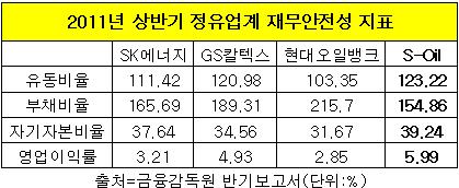 반면 S-Oil의 부채비율(154.9%)은 업계 1~2위인 SK에너지(165.69%)와 GS칼텍스(189.31%)보다 더 낮다. 부채비율은 현대오일뱅크가 215.7%로 가장 높다.