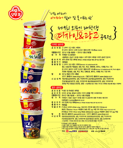 디자인 공모전은 오뚜기의 1등 브랜드 캐릭터나 오뚜기 패키지 디자인 및 용기 형태디자인을 리뉴얼해 출품하는 방식이며 광고 공모전은 진라면, 컵누들, 3분요리 브랜드 이미지 강화를 위한 크리에이티브로 TV광고 및 인쇄광고 제작물을 출품하면 된다.