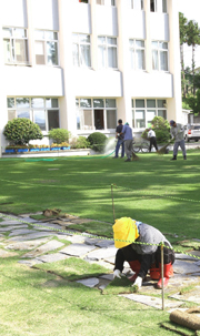 전남 강진군청이 주차장으로 사용했던 광장을 사철잔디광장으로 단장하느라 부산하다.