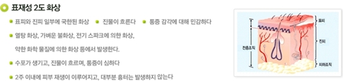 병원 측에 따르면 표재성 2도 화상은 가벼운 불, 열탕, 약한 화학 물질에 의해 발생하는 것으로 수포가 생기고 진물이 흐르며 통증이 심한 편.