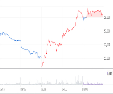 대한항공의 주가는 지난 7월 4일 7만2천300원으로 고점을 찍은 후 8월과 9월 완만한 하락세를 보이고 있다. 9월 1~5일 3거래일 연속 하락세를 보여 5만3천100원까지 떨어졌다가 저점이란 인식이 퍼지면서 다시 회복하는 중이다. 8일 종가는 5만9천200원을 기록했다.