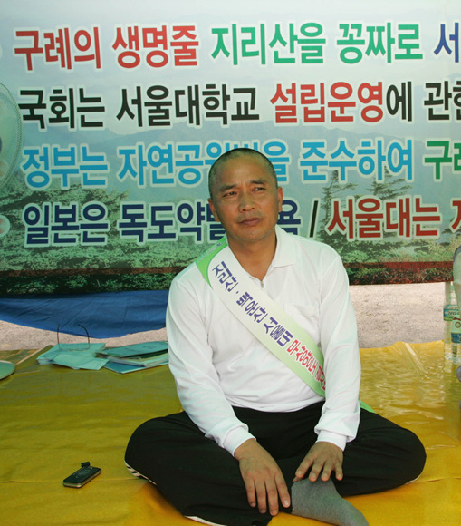 지리산찾아오기 집행위원회(위원장 김형찬)는 지난 8일 구례장터에서 ‘지리산 백운산 서울대학교 무상양도를 결사반대하는 구례군민 총 궐기대회’와 삭발식을 갖고 구례경찰서 로타리 앞에 설치된 부스에서 문길선 군의원이 1인 단식투쟁에 들어갔다.