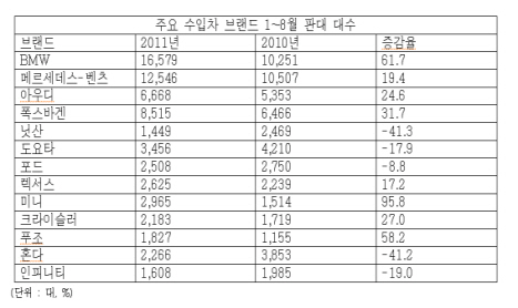 한편 BMW코리아의 또 다른 브랜드 미니도 1~8월 2천965대를 판매, 지난해 같은 기간(1천514대)보다 95.8%나 폭증했다.