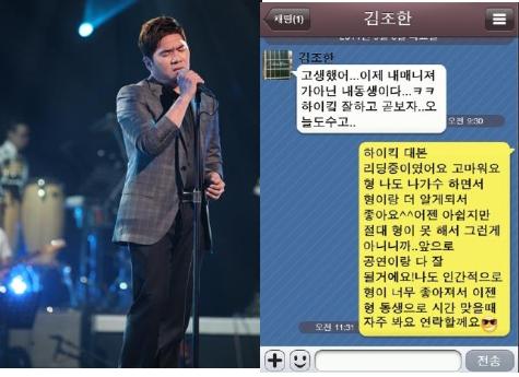 고영욱은 이 사진과 함께 “마지막 경연 촬영 다음날 이른 아침 조한이 형한테 온 카톡 문자 정말 좋은 형이다. 내가 느끼기엔 최고의 감성을 가진 가창력을 가진 가수다. 함께 해서 좋았고 난 조한형의 영원한 팬일거고 계속 응원을 보낸다”라는 글을 게재하며 끝까지 김조한을 응원하는 모습을 보여줬다.
