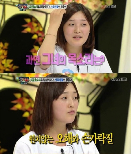 아기목소리녀는 “목소리때문에 또래 친구들로부터 ‘귀여운 척 하려한다’는 오해를 받아 이유없이 미운 시선도 받아야 했다”고 토로했다.