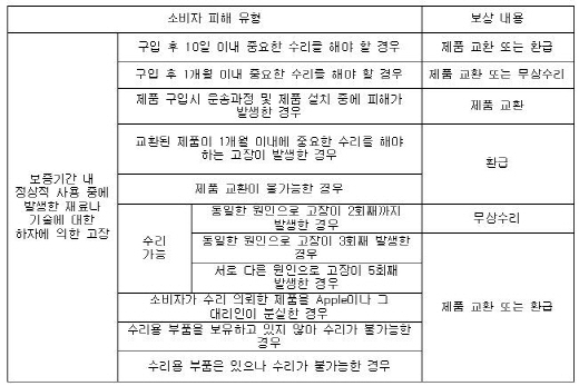 우선 제품 교환 기준은 애플이 아닌 소비자가 선택할 수 있게 개선되었다. 이에 따라 앞으로는 구입 1개월 이내 하자 발생 시 소비자가 리퍼폰과 새 제품 중 선택해서 교체 받을 수 있게 됐다.
