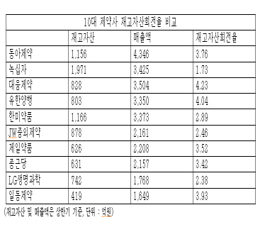 대웅제약은(4.23)과 유한양행(4.04)은 10대 제약사 중 유일하게 재고자산회전율 4 이상을 기록했다.