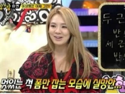 효연은 "지난 번 출연때 강심장에서 순수한 마음을 용기 있게 고백했는데 어떻게 알았는지 자기인걸 눈치채고는 멋있는 척을 하더라"며 그 이후 이상형이 깨져버렸다고 털어놨다.