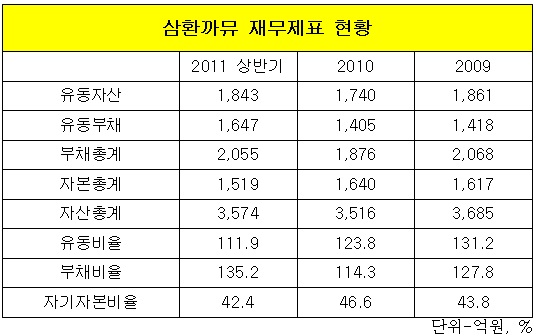 삼환까뮤의 부채비율은 2009년 127.8%에서 작년 114.3%로 다소 개선되는 듯 했으나 올 상반기 다시 135.2%로 악화됐다.