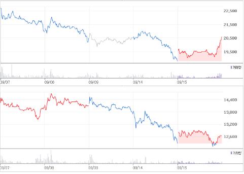▲SK컴즈(위) 및 로엔 주간 주가 동향