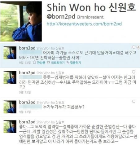 신 PD는 지난 13일 자신의 트위터를 통해 MBC TV `우리들의 일밤- 바람에 실려` 제작 관계자로 보이는 지인에게 “쯧쯧. 임재범꺼를 뭐하러 맡았어. 설마 여자는 안그러리라 믿지만 조심해. 수시로 주먹질하는 XXX이야. 그럼 지금 미국?”이라는 글을 남겨 논란을 일으켰다. (사진=신원호 PD 트위터)