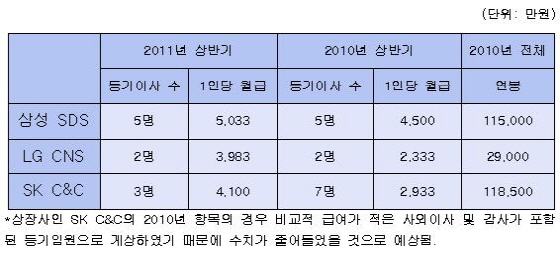 19일 금융감독원 공시를 통해 올해 상반기 실적을 발표한 삼성SDS, LG CNS, SK C&C 3개사의 등기이사 보수를 분석한 결과 1위 기업인 삼성SDS임원의 월급이 5천33만원 선으로 가장 많았다. 다음은 SK C&C로 4천100만원, LG CNS 3천983만원의 순이었다. 매출순위는 LG CNS가 앞섰으나 임원 급여는 SK C&C가 많았다.