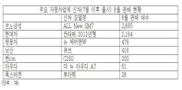 지난 7월, 8월간 국내에 출시된 총 18개 신차중 르노삼성자동차의 ALL-New SM7과 한국닛산의 박스카 큐브가 각각 국산및 수입차 시장에서 돌풍을 일으키고 있다. 일부 차종은 공급이 주문을 따라가지 못해 즐거운 비명을 지르고 있다.
