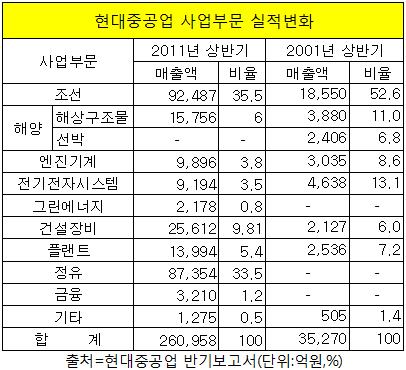 2001년 상반기 현대중공업의 조선부문 매출액은 1조8천억원으로 전체 3조5천억원의 52.6%를 차지했다. 그러나 10년이 지난 2011년 상반기 조선부문 매출액은 9조2천억원으로 8배 이상 늘어났지만, 비중은 전체의 35.5%로 감소했다.