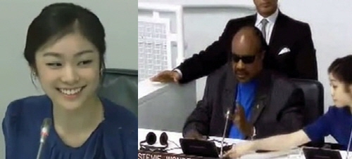 최근 한 온라인 게시판에는 ‘유엔 세계평화의 날’ 행사 청소년 대상 강연에 참석한 팝스타 스티비 원더와 김연아의 모습이 공개됐다.
