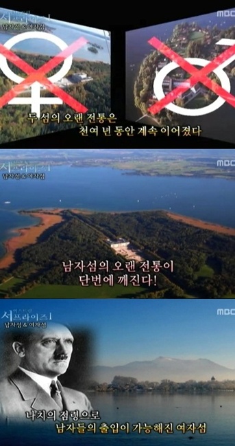 이날 방송에 따르면 8세기 프랑스 왕국의 지배를 받았던 독일 남동부 바이에른 주는 킴제 호수에 위치한 섬에 남자 수도원을 건설하면서 여자들의 출입을 금지했고, 근처에는 수녀원인 여자섬을 만들었다. 이후 남자섬과 여자섬의 역사는 천년동안 이어졌다.