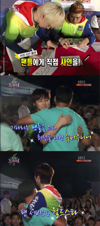 갑작스러운 경기 중단에 슈퍼주니어 멤버들은 팬들에게 사인과 포옹을 해주는 팬서비스로 시간을 끌었다. 또한 이특은 팬들과 댄스타임을 갖는 등 즐거운 시간을 선사했다.(사진=KBS2 캡처)