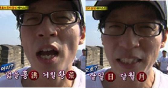 이에 다른 멤버들은 다음 글자를 전혀 말하지 못하거나 엉뚱한 대답을 한 반면, MC 유재석은 ‘집우 집주 넓을홍 거칠황 날일 달월 찰영 기울 측’을 거침없이 말해 천자문 실력을 공개했다.