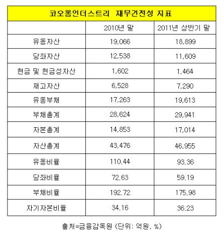 기업의 재무유동성을 나타내는 대표적 항목인 유동비율은 2010년 말 110.44%에서 93.36%으로 떨어졌다. 소폭 하락이긴 하지만 평균적으로 기업들의 유동비율을 150%이상일 경우 양호하다고 평가하는 점을 감안하면 코오롱인더스트리의 신용능력은 그만큼 상당히 불안한 수준이다.