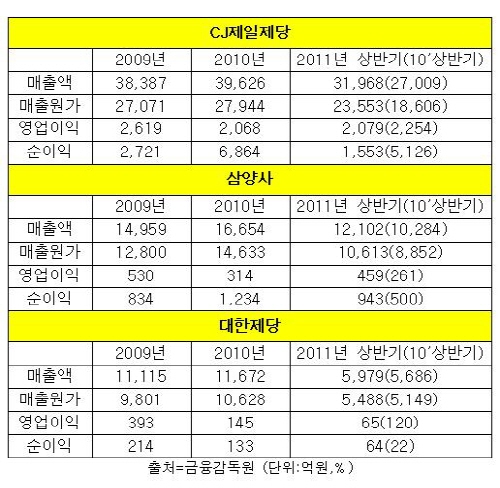 설탕 3사는 올상반기 매출액증가에도 불구 매출원가 등이 함께 늘어나며 영업이익과 순이익이 크게 줄었다.
