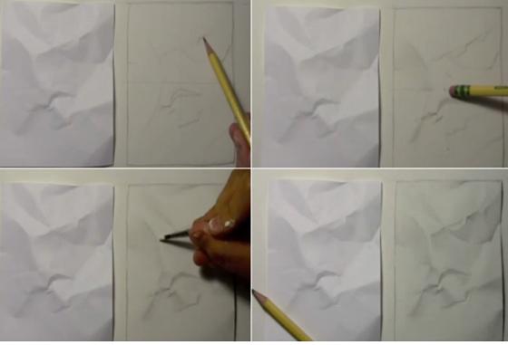 최근 온라인 커뮤니티에 올라온 이 영상은 종이는 구긴 후 왼쪽에 펼쳐놓고, 이 구겨졌던 종이를 보고 그대로 따라 그린다.