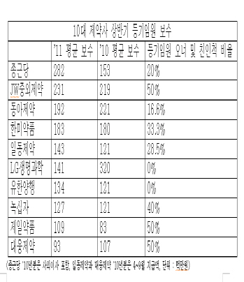 이같이 임원 보수를 올려준 제약사는 등기임원 중 오너나 그 친인척의 비중이 높은 회사인 경우가 많았다..